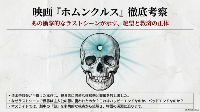 サスペンス 映画ホムンクルスの考察!結末の謎や原作との違いを徹底解説 映画『ホムンクルス』の衝撃的なラストシーンの謎を徹底解説します。本作の深層心理の可視化や名越が見た世界について、ホムンクルス映画考察を通じて紐解きます。原作との違いやトレパネーションの背景も含め、読めば納得できるホムンクルス映画考察の決定版です。結末の真意を今すぐ確認しましょう。 2026.02.04 サスペンス